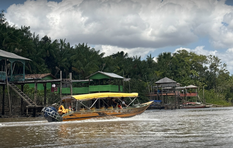 To get to the island of Combes, you need to take a speedboat from the Rui Balata Channel Terminal in Belém’s Princesa Isabel Square. The round-trip fare is R$24 and can be paid by cash, debit or pix. On Sunday the 9th, before COP30, the intersection was crowded with Brazilians and foreigners, and at the entrance there were several people handing out advertising pamphlets recommending restaurants to tourists.