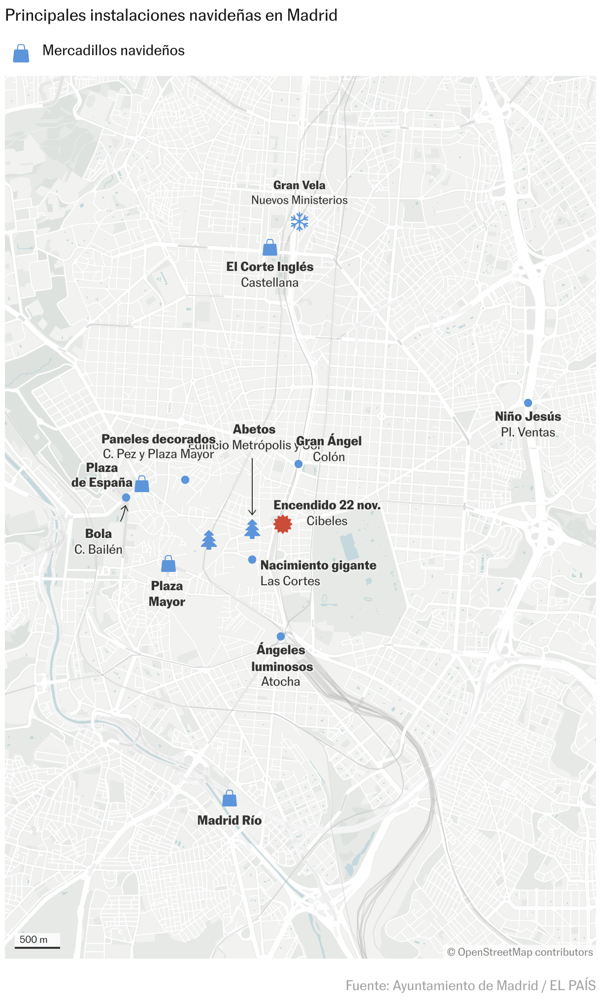 This year’s illuminations in Madrid will be translated into 126 glowing cherries and 7,134 notebooks, which, if placed on the same side on the return trip between Madrid and Toledo, will represent a total of 157 kilometers of decoration. To these are added 13 lighted fir trees and other reasons for a Christmas surprise.